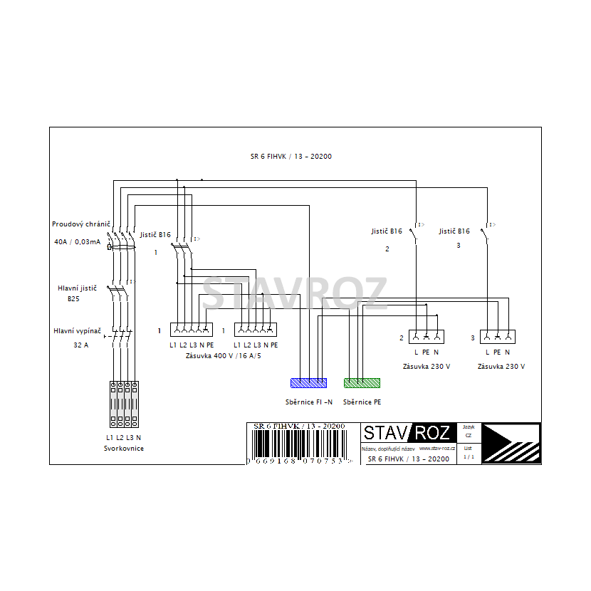 Staveništní rozvaděč SR 6 FIHVK / 13 - 20002 se stojanem s proudovým chráničem 40 A / 0,03mA a hlavním vypínačem